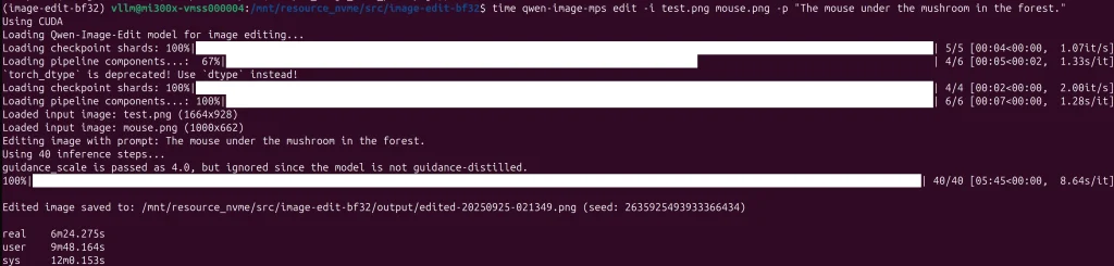 This type of simple editing, using about 30% of one of the 8 GPUs is a great teaser for Advanced Video Generation and we hope to come back and drive a full ComfyUI workflow with Qwen-Image-Edit-2509 with additional use of the Wan2.2 Models to take advantage of multiple GPUs working in parallel for the various video, audio and image components. There appears to be a strong use case for creatives that might prefer to more quickly iterate through draft ideas on high powered multi-GPU nodes, generating multiple images in parallel, early in the creative process, with the goal of returning to their personal serialized and slower desktop pipeline once the scope of work has been sufficiently reduced.