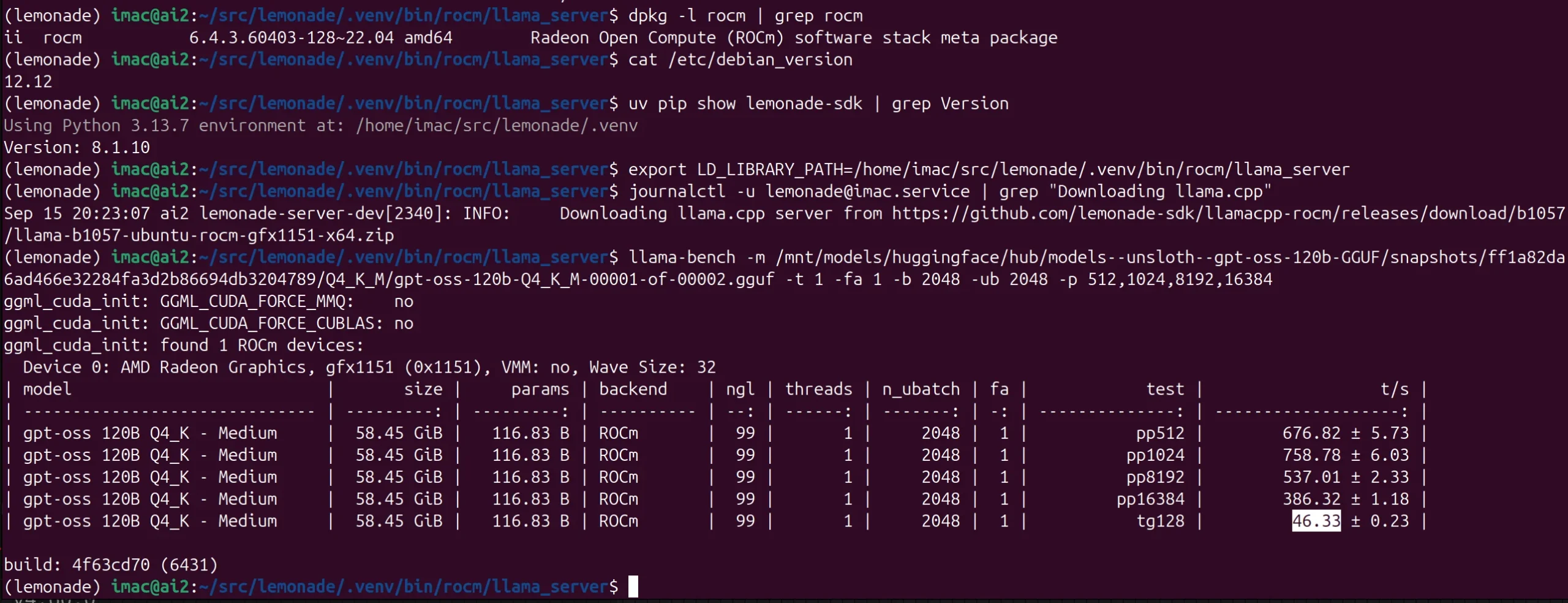GPT-OSS-120B – 46 t/s – Strix Halo – Debian 12 – ROCm 6.4 – LLAMA-ROCM b1057 (Lemonade v8.1.10)