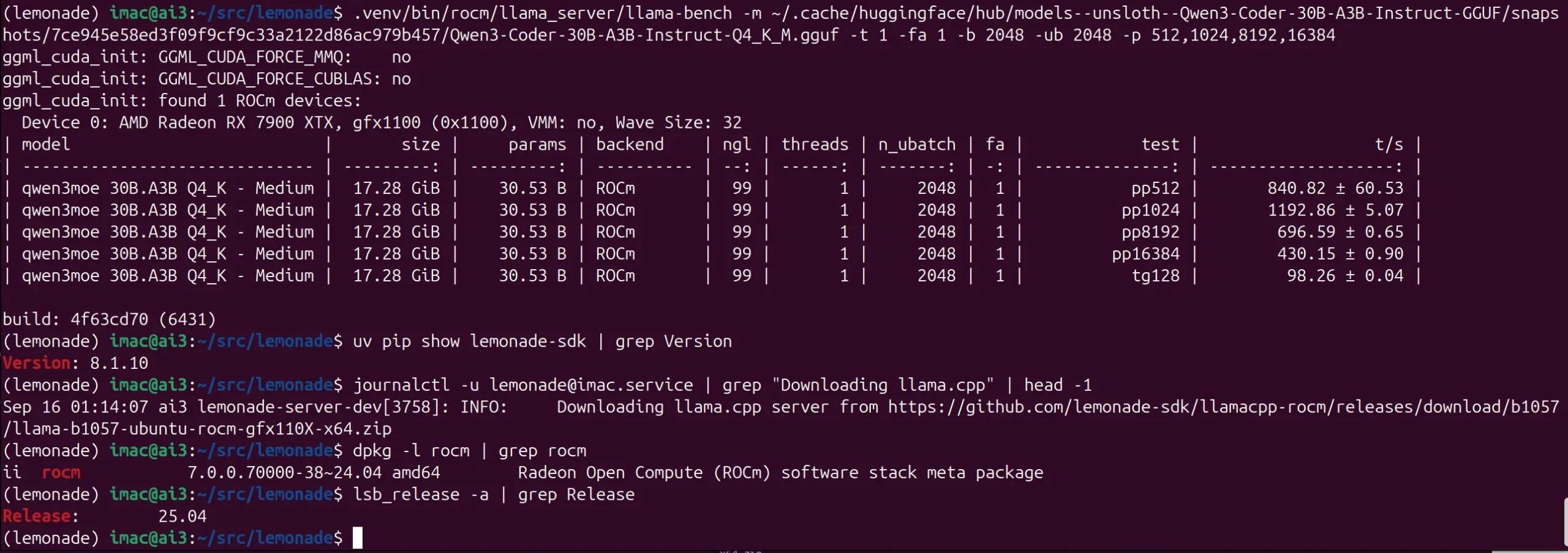 QWEN3-30B-Coder-A3B – 98 t/s – RX 7900 XTX – Ubuntu 25.04 – ROCm 7.0 – LLAMA-ROCM b1057 (Lemonade v8.1.10)
